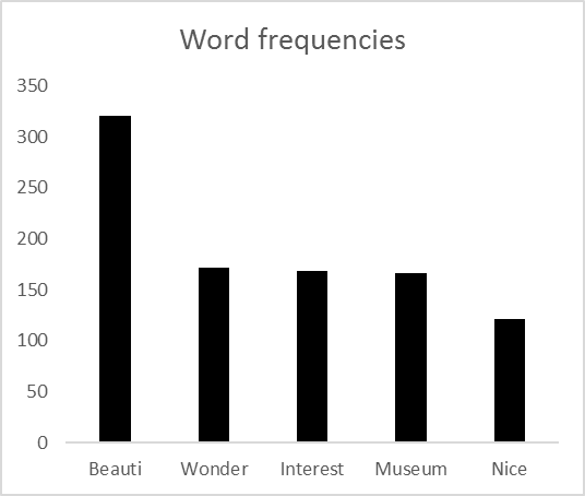 One important step in the analysis is to count the occurrence of each word in order to identify the most important ones. The most frequently occurring words are “beauti(ful)”, followed by “wonder(ful)”, “interest(ing)”, “museum(s)” and “nice”, which indicate that most people have positive sentiments about the activities developed by the Romanian museums (see Figure 3 ).
