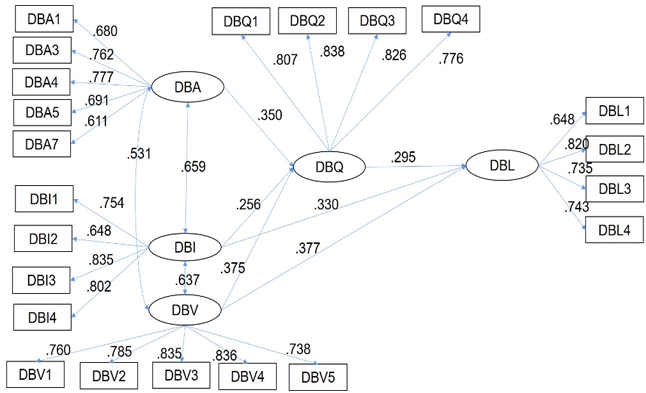 The moderation effect of DBQ is further verified by causal stepwise regression test. First, “c’” represents the regression coefficient of DBA\DBI\DBV to DBL when there is no intermediary variable DBQ in the model, which means the direct effect. Then “a” represents the regression coefficient of DBA\DBI\DBV to DBQ, “b” represents the regression coefficient of DBQ to DBL and a * b is the intermediary effect. The 95% confidence interval of the coefficient a*b does not include the number of 0, which indicates the intermediary effect is significant. “c” represents the regression coefficient of DBA/DBI/DBV to DBL when there is an intermediary variable DBQ in the model, the total effect. If both a & b are significant and c' is not significant, it is a complete intermediary. If both a & b are significant, and c' is significant, it is a partial mediation see Table 9. Therefore, in our study, DBA impact on DBL was completely mediated by DBQ. Meanwhile DBI and DBV impact on DBL either directly or indirectly mediated by DBQ see Table 8 and Figure 1.