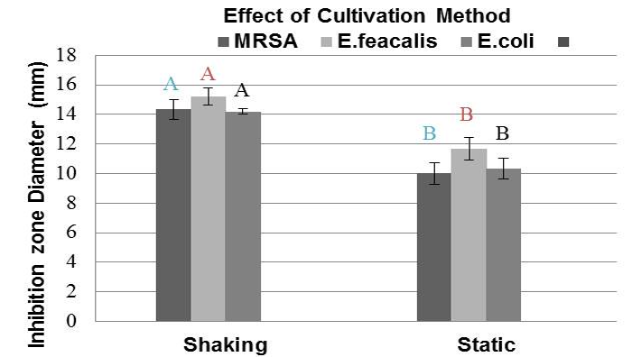 Figure-4. Effect of cultivation methods on the antimicrobial activity of Streptomyces tunisiensis SA-13