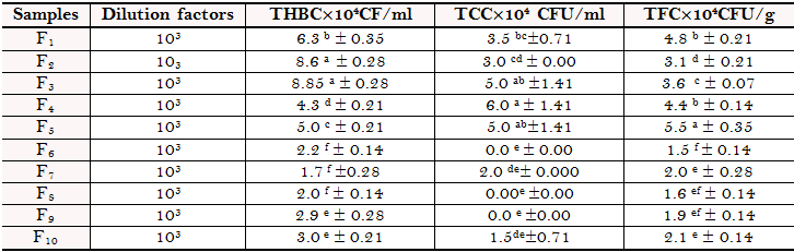 TFC was found to be from 1.5 ± 0.28 CFU/g - 5.5 ± 0.35 ×104 CFU/g. Similarly, there was significant difference (p < 0.05) in fungal counts among the spoilt pepper samples. The highest value of 5.5±0.35×10⁴CFU/g was recorded in sample F5 and was significantly different from all other samples. This was followed by samples F₁ (4.8±0.21×10⁴CFU/g) and F₄ (4.4±0.14×104 CFU/g) which was not significantly different from each other. The least fungal counts were obtained in sample F6 (1.5±0.28×10⁴ CFU/g) which was not significantly different from samples F8 and F9. Variations in counts could be as a result of level of microbial proliferation, handling and hygienic practices of the vendors.