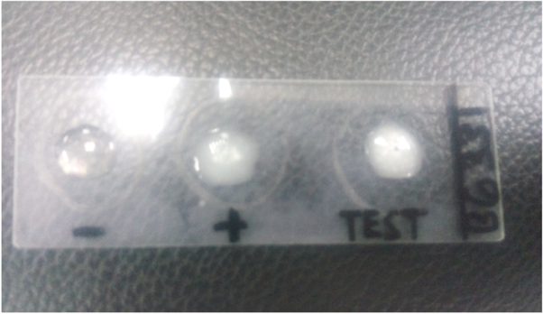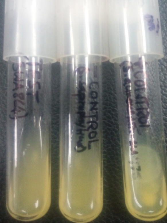 Sterile tubes, inoculating loop, permanent marker, Bunsen burner, matches, and 70% alcohol for sterilization of materials were prepared. The working bench was wiped with 70% alcohol to maintain aseptic environment. Three test tubes were prepared per test and labelled as ‘test’, ‘positive control’, and ‘negative control’. One in five dilution of human plasma in normal saline (0.85% NaCl) was prepared. Each test tube was filled with 0.5 mL of the diluted human plasma. Whilst human plasma is preferred for detection of clumping factor with staphylococcus, it is not recommended for routine testing, as it may contain antibodies against staphylococcus. To the test tubes labelled ‘test’, two to three drops of bacterial suspension was added.  To the test tube labelled ‘positive control’, two to three drops of known bacterial suspension (Staphylococcus aureus subsp. aureus ATCC® BAA-976™) was added. To the test tube labelled ‘negative control’, two to three drops of known bacterial suspension (Staphylococcus epidermidis ATCC 12228) was added. All the tubes were incubated at 37°C for 24 h. Each tube was observed hourly for clot formation by slowly tilting the tube at a 90° angle from the vertical. Some staphylococci produce fibrolysin, which could lyse the clot [14]. Presence of the clot after tilting indicates positive results. In the absence of clot after 24 h of incubation, incubation time was extended to 34 h at the same temperature. Any degree of clotting that remains after tilting the tube is recorded as positive result. On the contrary, absence of any degree of clotting is recorded as coagulase-negative result. After 24 h of incubation, the tubes were observed for fibrin clot formation.