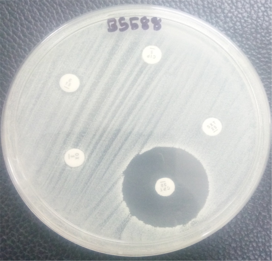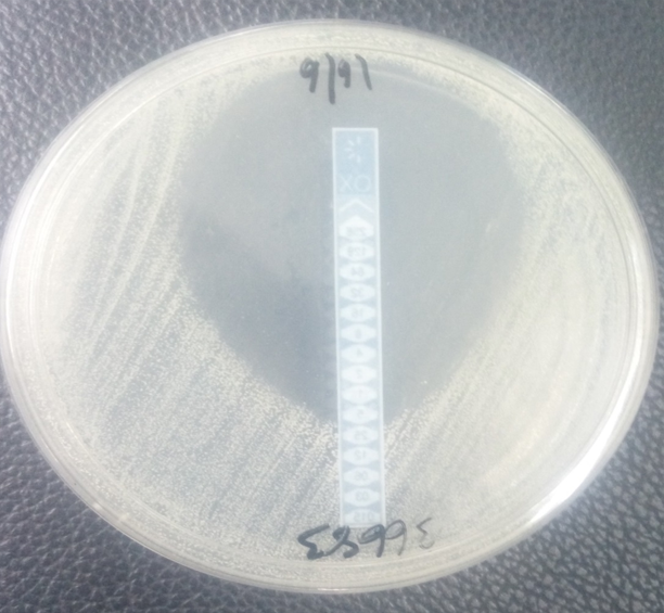 For greater zones of inhibition where growth of the organism does not intersect with the strip, the MIC should be read as less than the lowest value of the strip. However, this large zone of inhibition was not observed in our study.