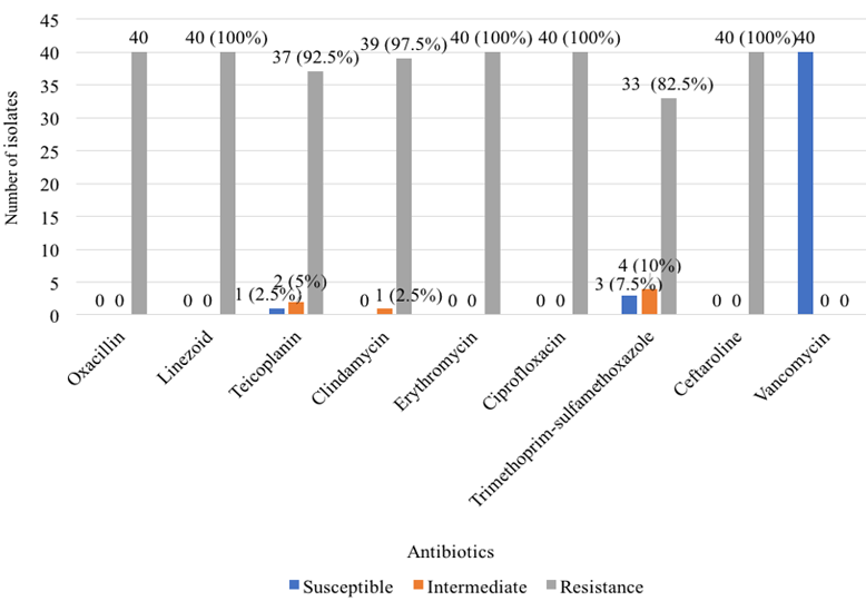 In our study, relatively high resistance levels of 82.5%, 92.5%, and 97.5% were observed against trimethoprim-sulfamethoxazole, teicoplanin, and clindamycin, respectively. These findings were similar to those found by Sani, et al. [10] who reported more than 80% resistance to teicoplanin. In contrast, Deyno, et al. [23] reported low resistance levels of 50% and 11% to trimethoprim-sulfamethoxazole and clindamycin, respectively. Our results were in contrast to the findings of Al Tayyar, et al. [20] who reported relatively low resistance of 64.1% and 45% to trimethoprim-sulfamethoxazole and clindamycin, respectively.