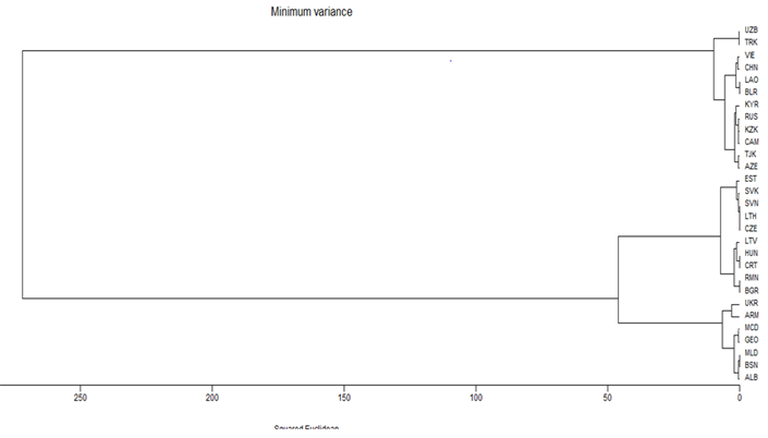 Aside from Cambodia and Azerbaijan, 3. cluster includes countries in Eurasian Economic Community. This economic integration that has been lasting more than 20 years, has economic, geographical and political bases. With these dimensions, it can be considered to be a similar formation to the European Union. The aim of this community is to establish a common market by setting a common foreign policy, determining tariffs and prices in the region (Eurasıan, 2016). Russia and Kazakhstan who are the members of the group, are economically stronger countries than Tajikistan and Kyrgyzstan as Germany and France, a locomotive twin and trying to keep power in the European Union (Yesdauletova and Yesdauletov, 2014). Mikheev (2006) claims that Russian elites which have significant power in the region act as unwillingness for other economies' economic developments. Mukhamedzhanova (2007) states that this integration does not offer a real production model. The fact that the member states first struggle for their own interests and then takes common interests into account is the most important reason for the failure of the countries that are members of this union. Mikheev (2006) and Mukhamedzhanova (2007) view support Acemoğlu and Robinson (2012) hypothesis in which even though they have an idea about the formulation necessary for growth, they are the most important obstacles to change in the current system because of their own interests. This argument can explain why the countries which have been scattered after Soviet Russia and are members of the Eurasian Union are in the same cluster. Kyrgyzstan, Russia, Kazakhstan and Tajikistan are among the member countries in the Shanghai Cooperation Organization while Azerbaijan and Cambodia are countries that have a dialogue partner with this organization.