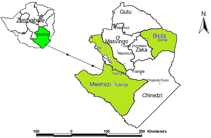 Masvingo province is divided into seven districts which are; Chivi, Chiredzi, Gutu, Masvingo, Bikita, Zaka and Mwenezi. Masvingo province occupies the drier lowveld area in the south of Zimbabwe. Major agricultural activities in the province are cattle ranching, subsistence crop farming and irrigated sugar growing. The rainfall pattern in this province is highly variable and uncertain, making the province prone to natural disasters especially droughts (Mapfumo and Madesha, 2014). Figure.1 shows the location of the study area. The specific study areas within the province (Chivi, Mwenezi and Bikita) were chosen in terms of high adoption of small grains in these districts.