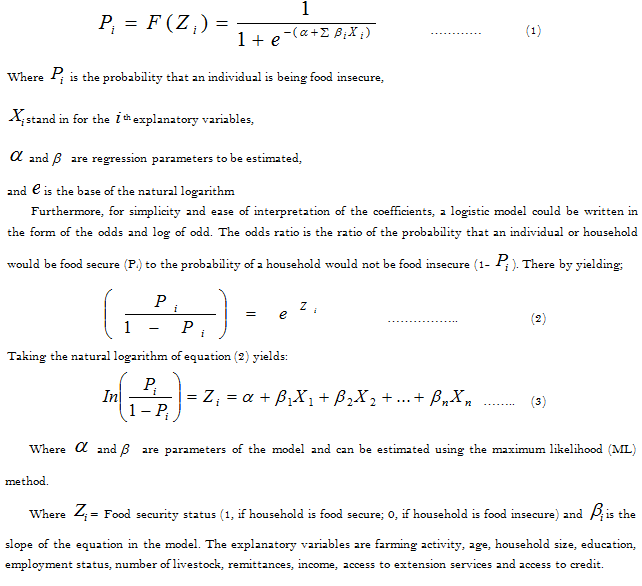 The parameter of the logistic regression model was estimated with the Maximum Likelihood Estimation (MLE) technique. A binary response function was specified and estimated by the logistic procedure. Food security status will be measured using a bid value of one or zero, where one represents food secure and zero represents food insecure. The logistic regression then provides a model of observing the probability of a household becoming food secure or food insecure. The binary logistic model adopted from Bogale and Shimelis (2009) is econometrically specified explicitly as: