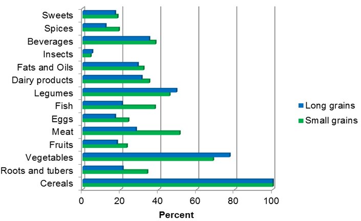 Figure-1. Percentages of food groups consumed by small grains and long grains sampled households