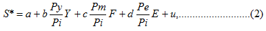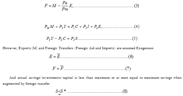 Where F is the foreign transfer which represents variables like foreign aid, foreign debt or imports in physical units and E represents exports in physical units. The P’s represents the price for respective goods measured in physical units, foreign exchange price for capital inflows (Foreign Aid, Foreign Debt, etc) and interest for foreign loans/debt. The two gap model assumes in (2) that savings gets a constant marginal share of while income from exports may have a differential effect and foreign transfer has a separate effect.