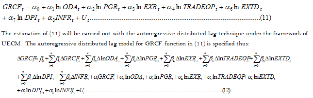 GRCF = Growth Rate of Capital Formation (this measures the rate at which the gross fixed investment (capital formation) of the country increases year after year. In this research. It can be derived through the application of the log function on capital formation.); ODA = Overseas Development Assistance (this is the amount of capital inflow in the form of aid).; PGR = Population Growth Rate (this measures the rate at which the population grows); EXR= Real Exchange Rate (This measures the price of a currency on an international platform. In this study, it is the price at which 1 dollar is bought in Naira); TRADEOP = Trade Openness (this is the ratio of Exports plus Imports to GDP); EXTD = External Debt (this is debt owed to external sources); DPI = Domestic Private Investment; INFR = Inflation Rate (this measures the aggregate price level).