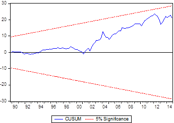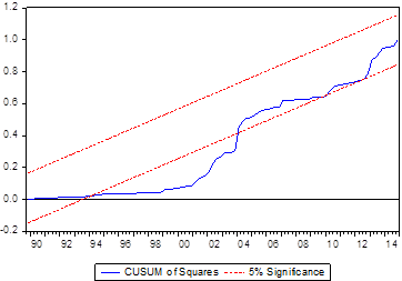 The Cumulative Sum (CUSUM) and Cumulative Sum of Squares (CUSUMsq) which is used to evaluate the stability of the regression coefficients shows that the coefficients are stable using the CUSUM test. This is informed by the empirical fact that the blue variable line is bounded by the red lines at 5% level of significance under the framework of the CUSUM test. We therefore accept the null hypothesis that the parameters are stable. Hence, the coefficients of the model do not change systematically. Even though the CUSUM of squares blue lines fell out of the red line boundary between 1994 and 2004, the stability of the model bounced back immediately after that period.