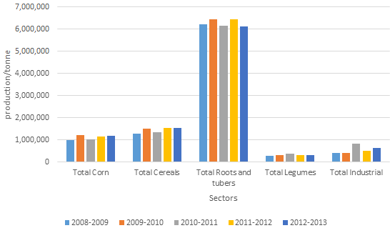 In the Figure 1, we can see that the roots and tubers production is very high because they are used every day and consumed locally. The industrial production is basically for exportation especially cotton which count for 80% for export revenue.