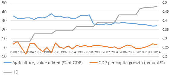 In the study we find that there is a long-run relationship between GDP per capita, agricultural value added and the human development index. An expansion in agricultural sector will have a significant impact on the GDP per capita in the long-run.
