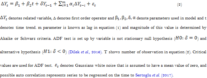 In this paper, we employ ADF test to examine the existence of unit root in the series. The ADF equation is given below (including constant and trend case):