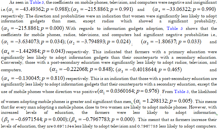 Not only did this study incorporate the aspect of adoption of information gadgets but also investigated their use to obtain agricultural information across the gender and education spectra. This, therefore, provides a medium through which policy makers can disseminate agricultural information based on the specific socio-demographic category of interest.