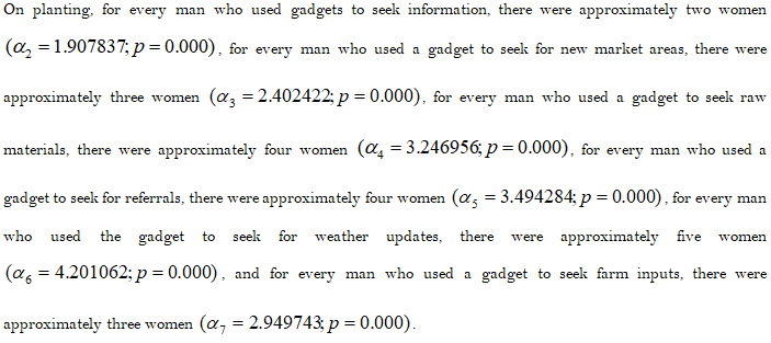 From Table 8, those with a primary education were less likely to use the information generated from the information gadgets in planting, marketing, sourcing raw materials, referrals, checking for weather updates, and sourcing inputs than those with a secondary education. Given the signs and the probabilities on the agricultural activities, except the probability on cultivation, those who had left at primary school level were less likely to use information gadgets to seek for information than those from secondary schools. Conversely, those with post-secondary school qualifications were more likely to use information gadgets to seek for information than those in secondary schools.