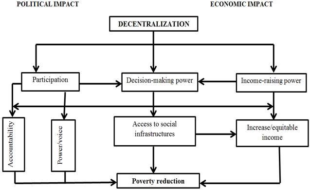 Generally, the link between decentralization and poverty alleviation can be seen from both a political and/ or economic dimension. On a political perspective, decentralization brings about increased opportunities for people to participate in public decision-making, from which they are generally excluded in a highly centralized government system (Asante, 2003; Crook & Sverrisson, 2001; World Bank, 2001). This in itself represents a form of poverty alleviation as poor people are given voice and thus power, provided the citizens’ voices are heard (Goetz & Gaventa J, 2001).