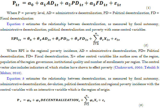 To study the effects of decentralization on poverty, we exploited a dataset from the ministry of decentralization (Devkota & van Teijlingen, 2010). Equation 1 estimates the relationship among the different forms of decentralization (fiscal autonomy, administrative decentralization, political decentralization) on poverty with the absent of control variables.