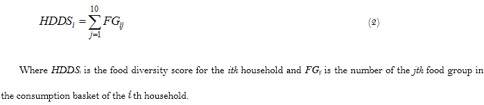 FANTA's HDDS measures the number of different food groups categorized into 12 subgroups, consumed by a household over a given reference period on the 24-hour recall time. HDDS is an appealing proxy because a more diversified diet is an important outcome in and of itself. It is associated with a number of improved outcomes in areas such as birth weight, child anthropometric status, and improved hemoglobin concentrations (Swindale & Bilinsky, 2006a; Swindale & Bilinsky, 2006b). Typically, HDDS is used in the socio-economic analysis of an entire household. This study adopts a revised version of HDDS based on ten food groups (as shown in Table 1) while using the GLSS criteria allowing the 7-day recall period due to data unavailability (i.e., 24-hour window of the HDDS procedure). The study made the household food consumption assessment based on the ten food groups. When a household consumes one food group, it is scored 1; 2 for two food groups; 3 for three food groups; up to 10 for ten food groups. The HDDS variableis calculated for each household in Equation 2 as: