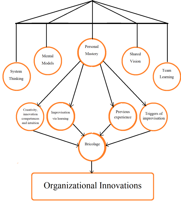 Building on Senge’s learning organization model of the five principles of a learning organization, this research offers an integrated framework, which differs from Senge’s model, as it illustrates personal mastery as the dominant component above the other four phases of learning organizations. It also clarifies that personal mastery represents not merely a person’s characteristics, rather it supports and fosters other domains such as triggers of improvisation, past experience, improvisation activities via the learning process, and the tripartite competences (creativity, innovation, and intuition) that support improvisation for innovation. Overall, personal mastery fosters the capability of bricoleurs to convert all these competences into innovations. The current research indicates that, in a time of crisis and challenges, certain domains of Senge’s learning organization model may take precedence over others, requiring solo doers who can orchestrate and master resource constraints in an effective and efficient way to achieve innovations in their organizations.