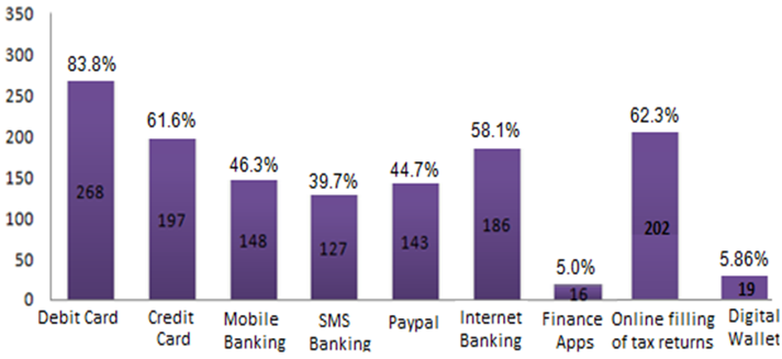 The survey instrument attempts to capture the extent to which financial technologies are used by young Mauritian professionals to handle routine financial transactions, as depicted in Figure 1. More than 50% of the respondents make widespread use of traditional Fintech products, such as debit cards, credit cards and internet banking. It is worth noting that a large proportion of respondents files their tax returns online. This may be due to the numerous advantages it offers, like extended deadlines, and the financial gains that the Mauritius Revenue Authority is proposing for users of e-Filing.