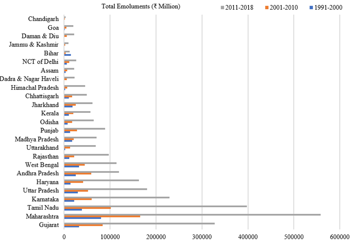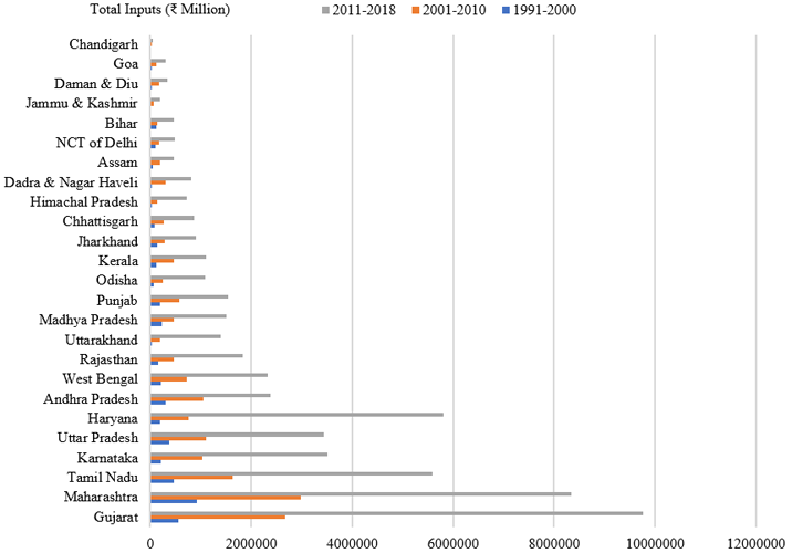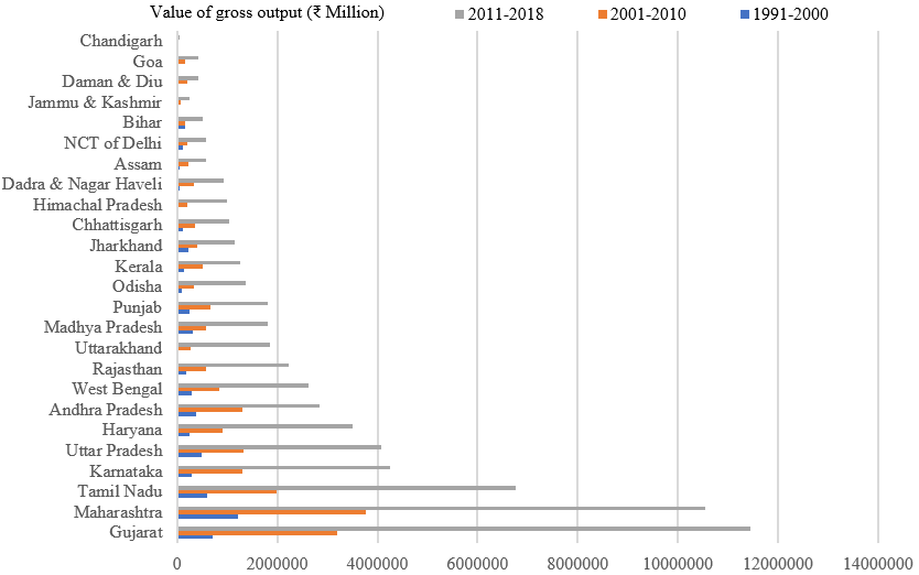 The descriptive results based on time trend analysis show that industrial development is on a growing path in India. However, there still exists a high diversity in industrial development between the different Indian states, due to variation in infrastructural development, number of factories and industrial workers, capital investment, the banking sector, credit support to industries by scheduled commercial banks, branches of scheduled commercial banks, geographical location, agricultural production, educational level of workers, per capita income, social inclusion, business ecosystem, research institutions, government policies, population growth, demand for goods and services, inflation, availability of skilled manpower, ecosystem services, capital formation, market structure, saving and investment patterns of people, and technological development. It has been reported that Gujarat, Maharashtra, Tamil Nadu and Karnataka hold the 1st, 2nd, 3rd, and 4th position, respectively, in industrial development among the Indian states. Furthermore, Gujarat, Maharashtra, and Tamil Nadu contribute around 40% of the value of gross output, gross value added, invested capital, number of factories, gross capital formation, total inputs, total persons engaged, and total number of emoluments in Indian industries at the national level. Therefore, these states make a greater contribution to the industrial development of India. Thus, it is suggested that other Indian states should implement effective and conducive industrial policies to create a business ecosystem that will increase their share in the industrial development of India.