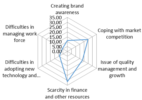 Regarding the major issues business owners reported facing in the course of operating their business, 31.22% of respondents noted the scarcity of available finance and other resources to run their business (Figure 1). In this regard, Tmava et al. (2013) asserted that small firms experience more difficulties in accessing external financing sources than larger firms, making them more dependent on internal funds to finance their investment needs. Similarly, coping with market competition (24.56%); issues of quality management and growth (18.24%); creating brand awareness (11.22%); difficulties in adopting new technologies and other processes (9.12%); and difficulties in managing the work force (5.61%) are other issues reported by the respondents.
