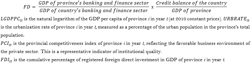 Although migration can affect poverty, the selective nature of migration makes it possible for poverty to have a negative impact on migration: poverty is both a driver of migration and a constraint on migration of the poor. Similarly, low human capital and a high share of labor employed in agriculture lead to low productivity and income, and, in turn, low poverty. However, poverty makes it difficult to invest in human capital, as untrained workers become trapped in the agricultural sector and have difficulty moving into other areas. In this case, using a pure one-equation model and ignoring the simultaneity between the variables would have endogeneity – the explanatory variables are correlated with the random error in the model. This leads to bias and inconsistent OLS estimations for each equation (Gujarati & Porter, 2009). To solve this simultaneous relationship, the study uses the following simultaneous equation model:Since this index is not available for all provinces for the period between 2010 and 2019, this index was estimated based on the recommendation by Le & Chu (2020). Accordingly, FD is estimated according to the following formula: