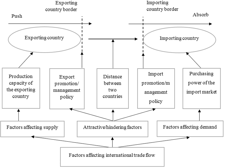 Exporting and importing are two activities that form the international trade flow and cannot be separated. Assuming countries A and B have a commodity exchange relationship with each other, the quantity of goods exported by country A to country B is also the quantity of goods imported by country B from country A. Therefore, studying the determinants of a country’s exports does not only involve that particular country, but is also directly related to the importing country. Research by Dao (2008) simulated the determinants affecting international trade flow with three main groups of factors and is detailed in Figure 1.