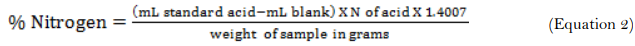 A 0.5 g each of the samples was weighed into 50 mL Kjeldahl flask and 5 mL concentrated sulphuric acid was added with a catalyst. The flask was treated gently then strongly until it digested completely leaving a clear (grey-white) digests. It was allowed to cool, filtered, washed and made up to 50 mL volume of the volumetric flask. The digest was distilled with 40% sodium hydroxide through 5 mL 2% boric acid solution. Three drops of mixed indicator were used and 40 mL of each sample was collected and back titrated using 0.01 M HCl. The % Nitrogen content was calculated according to the equation (equation 2)