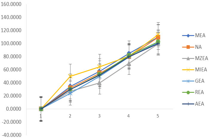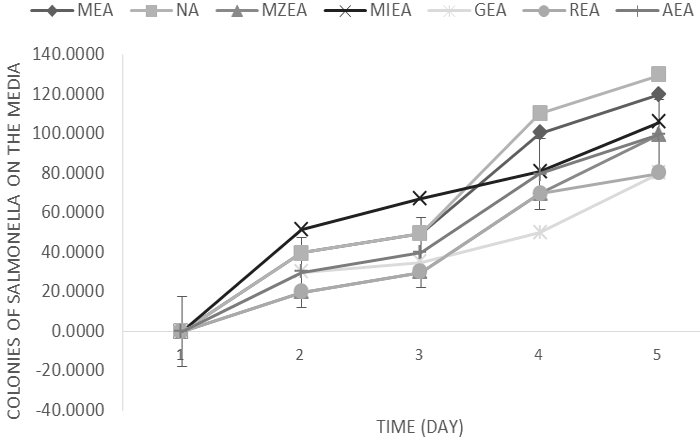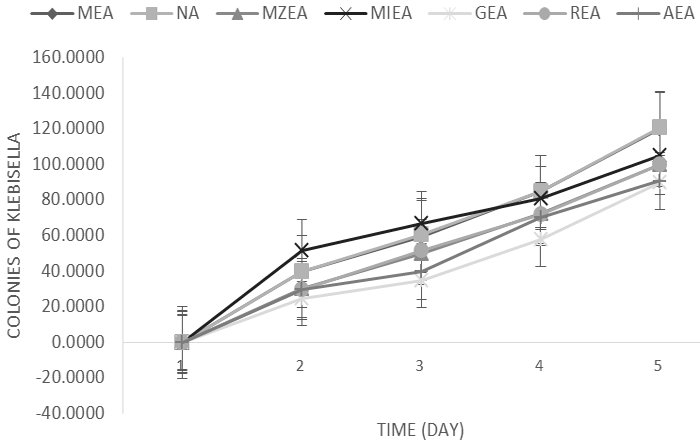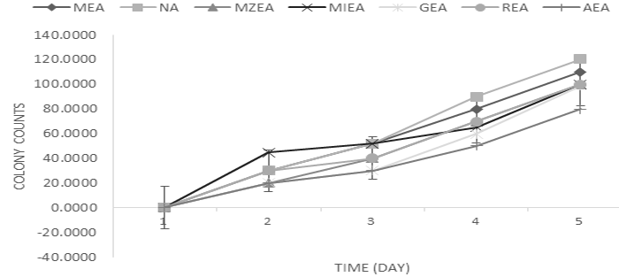 Growth rates of Klebsiella on MEA and NA were almost the same in day 5 of the experimental period. However, there was a significant difference in growth between NA and MzEA, MzEA and MiEA, MiEA and GEA, GEA and REA. Similarly, a significant difference in growth existed between REA and AEA. The highest growths were on MEA and NA however, MiEA best growth environment amongst the formulated media.