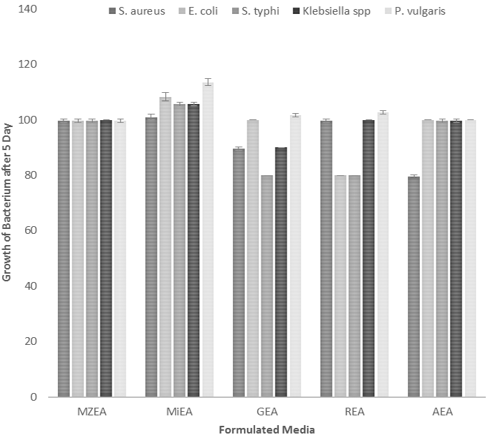 The comparison of the time course of bacterial growth on the formulated media showed that S. aureus, S. typhi, Klebsiella species, P. vulgaris showed equal growth on MZEA. P. vulgaris was highest on MIEA, AEA. E. coli, S. typhi, Klebsiella spp and P. vulgaris showed equal growth (Fig. 6).