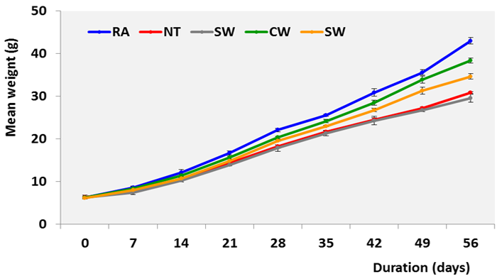 Fish final weight, after 56 days of rearing, varied between 29.57 ± 0.96 and 43.01 ± 0.78 g. Fischer's LSD test showed no significant difference (P>0.05) between final mean weight of treatment NT (30.87 ± 0.24 g) and DW (29.57 ± 0.96 g). CW and SW had high value but lower compared the control diet (P<0.05) as shown in Fig. 1. Daily weight gains varied from 0.42 to 0.66 g/d, with no significant difference (P>0.05) between treatment NT and DW and between CW and SW. The two groups (NT, DW) and (CW, SW) were statistically different (P<0.05). However, these values were lower than those obtained with commercial feed.