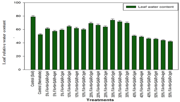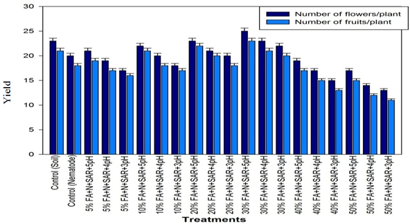 Moreover, it was seen that pumpkin treated with 50% FA + SAR (5.0pH, 4.0pH, 3.0pH) caused greater reductions in plant biomass such as growth, yields, chlorophyll, carotenoids, protein, carbohydrate, leaf water content and leaf area followed by 40% FA + SAR (5.0 pH, 4.0 pH, 3.0 pH). Overall highest growth status in plant was recorded in the 30% FA + 5.0 pH inoculated with 2000 J2 of M. incognita. However maximum negative effects were observed in 50% FA + SAR (5.0 pH, 4.0 pH, 3.0 pH) inoculated with 2000 J2 of M. incognita treated plant. In addition, irrespective of dose levels of FA and SAR either singly or jointly when applied, caused significant reductions in nematode multiplication.