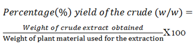 The solvent-solvent extraction method was used to determine the various fractions Fourty two gm(42g) of the methanol extract, was transferred into a 500ml flask containing 150mls of methanol and 100ml of distilled water was added and stirred. The mixture was transferred into a separating funnel and 200mls of pure hexane was added and carefully shaken. This solution obtained was allowed to stand for 10minutes in order to ensure proper partitioning of the two phases and the hexane layer (at the top) was collected after releasing the methanol/water layer. This process was repeated (about 8 times) until a clear layer was obtained for the hexane portion. The same procedure was repeated to obtain the ethyl acetate fraction. The various fractions obtained were then concentrated using the rotary evaporator and vacuum oven at 400C and the percentage yields for the various isolated fractions and the crude extracts obtained were calculated using the formula stated below (AOAC, 2000).