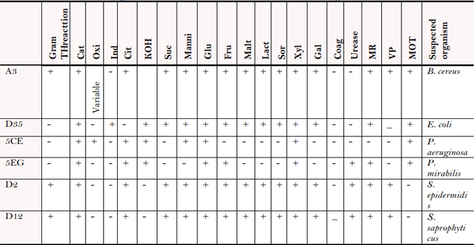 The source and the code of different organisms used is shown in Table 1. The bacterial isolates used in this study include Staphylococcus epidermidis (D2), Escherichia coli (D35) and Staphylococcus saprophyticus (D12) which were isolated from Hospital waste while Bacillus cereus (A3), Pseudomonas aeruginosa (5C) and Proteus mirabilis (5E) were isolated from hospital environmental.