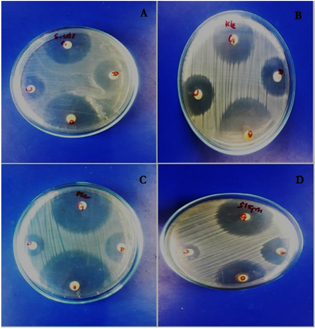 A: Escherichia coli; B: Klebsiella pneumonia; C: Pseudomonas aeruginosa; and D: Staphylococcus aureus.