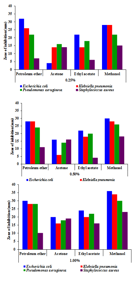 Among the extracts, the firmly present phytochemical constituents were the flavonoids and anthraquinones in petroleum ether; flavonoids, terpenoids, triterpenoids, phlobatannins and anthraquinones in acetone; alkaloids and terpenoids in ethyl acetate; and flavonoids, terpenoids and phenols in methanol. Avaram tea point out the solid presence of triterpenoids and phlobatannins. The antibacterial activity signifying the zone of inhibition by Senna auriculata floral extracts are presented in Figure 2. At concentration 0.25%, methanol extract was found to exhibit the maximum activity (32mm) against Escherichia coli followed by acetone (28mm) and petroleum ether (15mm) extracts in Staphylococcus aureus, and by both the microorganisms reported above (22mm) in the ethyl acetate extract. At 0.50% concentration, it was methanol, trailed by acetone, ethyl acetate and petroleum ether extracts which specified maximum activity by hindering the growth of Staphylococcus aureus and their respective values were 30, 28, 26 and 18mm, and acetone extract (28mm) against Escherichia coli. A similar pattern followed at 1.0% preventing the growth of Staphylococcus aureus and the values were 36, 34, 30 and 23mm respectively Figure 3 ; Table 2. Overall results indicated that among the bacterial strains tried, supreme antibacterial action at the lowest concentration (0.25%) was unveiled by the petroleum ether extract against Escherichia coli; acetone extract against Staphylococcus aureus; ethyl acetate extract against Escherichia coli and Staphylococcus aureus, and methanol extract against Staphylococcus aureus; and at the highest concentration (1.00%) it was displayed against Staphylococcus aureus for all the extracts except for methanol against Klebsiella pneumonia. The order of the antibacterial efficacy was petroleum ether>ethyl acetate>acetone>methanol extracts proving their efficacy against Gram positive and negative strain, i.e. Staphylococcus aureus and Escherichia coli.