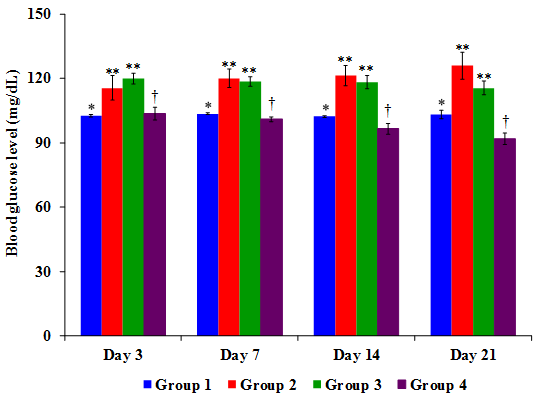 As for the antidiabetic activity, Figure 4 displayed the initial and final body weight of diabetic rats treated with streptozotocin. The final body weight of rats in all the groups significantly decreased (P<0.05) with the exception of Group 1 which showed a mild increase Table 3. Considering the body weight of mice after treatment, it was found that Group 1, 3 and 4 demonstrated a reduction in their body weight on Day 7 when compared to Day 3 and thereafter an increase on Day 14 and 21 and the values were 30.0, 27.3, 30.3 and 30.3; 27.3, 23.3, 27.6 and 28.0; 26.3, 22.2, 23.0 and 25.5g respectively Figure 5; Table 3. Figure 6 presented the initial and final level of blood glucose of rats. Group 2, 3 and 4 recorded a critical increase (P<0.05) in their final blood glucose level on Day 7, whereas in Group 1 it was vice-versa Table 3. While observing the level of blood glucose after treatment, it was observed that there was an increase in blood glucose level in Group 2 and their respective values were 115.6, 120.0, 121.3, and 126.0mg/dL. Group 3 and 4 indicated a decrease in blood glucose level right from Day 3 to 21 and their respective values were 120.0, 118.6, 118.3 and 115.6; 103.6, 101.0, 96.6 and 92.0mg/dL. While Group 1 exhibited an increase in blood glucose level from Day 7 when compared to Day 3 and from there on a slight reduction and increase on Day 14 and Day 21 and their respective values were 102.6, 103.6, 102.3 and 103.3mg/dL Figure 7; Table 3.