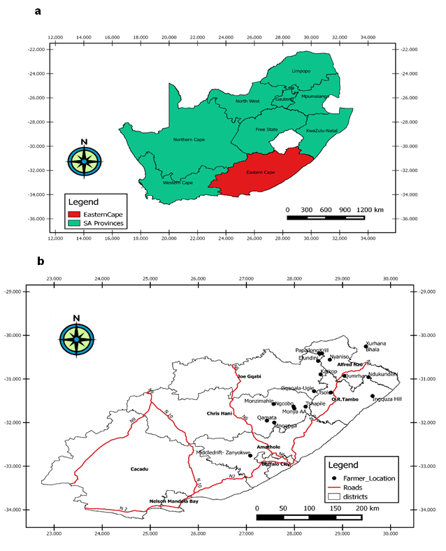 Figure-1. Maps of Eastern Cape Province showing (a) the location of the province in South Africa (b) Localities where interviews were administered to maize farmers (Maps source: Survey coordinates and CSIR spatial data repository).