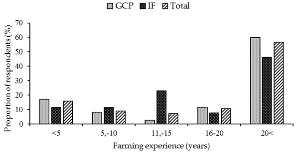 Household heads of the two groups were slightly gender biased with 51.7% of GCP and 59.6% of the IF households were headed by males Table 1. There were no significant differences (p=0.31) on the household heads gender representation between the two groups. The age of the GCP household heads ranged between 27 and 82 years and the IF farmers’ age ranged between 23 and 89 years. The average age of the farmers was 57.9 years for GCP and 56.3 years for IF farmers. There were no significant differences on the household heads’ age (p=0.41), level of literacy (p=0.27) and family size (p=0.11) between the farmer groups. There were significant differences (p=0.05) on farm size holdings between the two farmers’ groups with GCP having an average of 1.8 ha whereas IF farmers had an average of 2.8 ha. There were significant differences (p=0.05) on the proportion of the farm land allocated for maize production. The majority of GCP farmers (86.1%) allocated the whole farm land for maize production, whereas 75% of IF farmers allocated for the same. About 13.5% of the IF farmers allocated half of their farm land to maize production, whereas 3.9% of the GCP allocated the same Table 1.