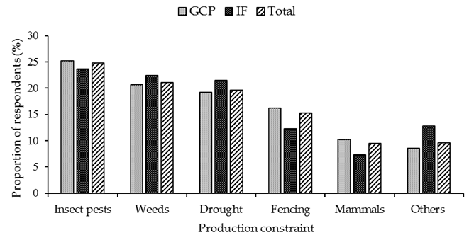 A semi-structured questionnaire with closed and open-ended questions was used to extract information by interviewing a total of 232 farmers under the government cropping programme (GCP) (180 farmers) and independent farmers (IF) without government sponsorship (52 farmers). Government extension officers and farmer’s village chairpersons assisted in the identification of the farmers under the government programme. Separate interviews were conducted targeting independent farmers. Questions presented to the respondents included the type of maize cropping system practiced, agronomic practices and perceptions of production constraints. The number of farmers interviewed per district varied from a minimum of 21 in Chris Hani, 23 in Amathole, 43 in Alfred Nzo, 60 in Joe Gqabi to a maximum of 85 in O.R Tambo district. The differences were due to variation in number of maize producing farmers in the districts and accessibility of the farming community. Frequency counts and percentages were calculated based on the farmer response for each question asked. In instances when a farmer did not respond to a particular question, they were excluded in the calculation of the percentages. In cases of multiple response questions, percentages were calculated for each category. SPSS Version 24 statistical package was used to carryout Binomial regression analysis and Chi-square analysis. Independent sample t-tests were used to test differences between GCP and IF farmers’ responses in relation to the cropping system practiced and their perceptions. The multiple response variables were subjected to the Cochran’s test and P-values were adjusted using the Bonferroni method. Differences were considered to be significant at the 5% level.