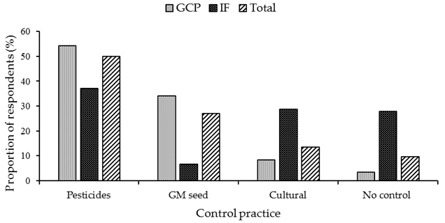 There were no significant differences on how the interviewed farmers perceived aphids (p=0.17) and pollen beetles (p=0.12) on their importance in maize production. Both farmer groups employed various control strategies to combat pest attack. There were significant differences (p=0.00) on how farmers employed pesticides and GM maize in the control of pests. The GCP farmers relied heavily on pesticides (54.2%) and GM maize (34%) in the control of pests. In contrast, only 37% of the IF farmers employed pesticides to control pests Table 4 and Figure 4. Greater proportion of GCP than IF farmers applied chemicals and planted GM maize as strategies of pest management. Pesticide application was based on a calendar schedule and the majority of interviewed farmer’s sprayed carbamate (carbaryl) for the control of stalk borers, cutworms and bollworms. Glyphosate-based herbicides were applied for the control of weeds and some farmers used actellic dust for the control of storage insect pests. The majority of GCP farmers planted GM maize (Bt gene) intended for the control of stalk borers with a small proportion growing roundup-ready (RR) varieties for easier control of weeds in the fields. Cultural methods of pest management were significantly (p=0.00) and largely employed by IF (28.7%) than GCP (8.4%) farmers. Some of the IF farmers cited that chemicals were expensive and out of reach for them. Farmers employed cultural pest control through field sanitation, wood ash and livestock meat fat on maize crops to attract natural enemies in the control of stalk borers and bollworms.