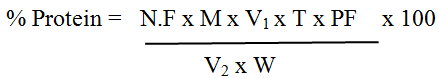 Where; N.F = Nitrogen factor (0.014); M = Molarity of HCl (0.01); V1 =Final volume of digest (50ml); V2 = volume of digest used (10ml); T=Titre volume of distillate; W= Weight of sample used; PF= protein multiplication factor (6.25) (AOAC, 2012).