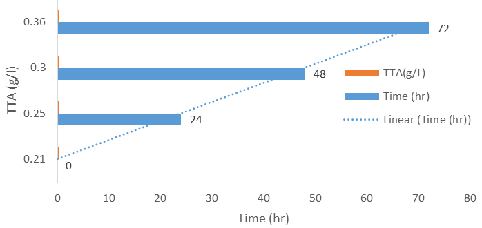 Figure-2. Changes in TTA (g/L) during the fermentation of banana peels. TTA increases with with increase in fermentation time. Therefore, TTA increases with a simultaneous decrease in pH. The TTA ranged from 0.21 at 0 hr to 0.36 at 72 hr during the fermentation of banana peels.