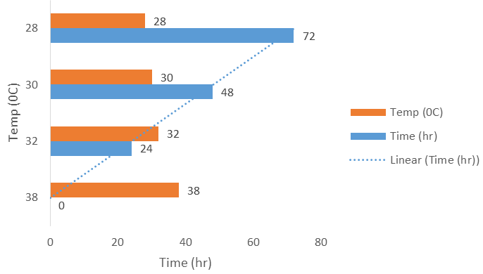 Figure-3. Changes in temperature (0C) during the fermentation of banana peels. Temperature was observed to decrease with increase in fermentation time. The temperature ranged from 38 0C at 0 hr to 28 0C at 72 hr during the fermentation process.