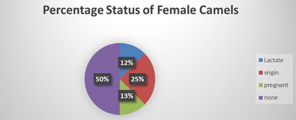 On the status of the female camels admitted to this study, of the 7 female camels that their 14.3 % were lactating, 14.3 % were pregnant, 28.6% were virgins and 57.1 % were having no condition among the mentioned status.