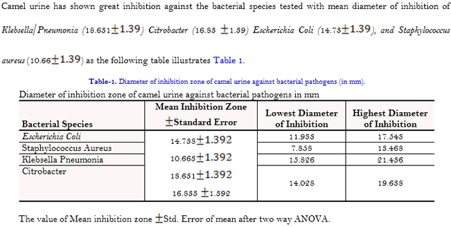 ) Table 1 and in agreement with a study conducted by Jamal, Mohammed Issa, Abdul Bagi, and Rabie (2019)in Sudan with aim to evaluate the antimicrobial effects of Camel's urine in bacteria isolated from clinical specimens of wounds collected from patients admitted in Kassala teaching hospital and also study by Alzahrani and Alharbi (2011). Our findings are also in similar accord with a study by Mostafa and Dwedar (2016) that has reported that camel urine is proved to have in-vitro antibacterial ability with regard to clinically important multidrug resistant bacteria.