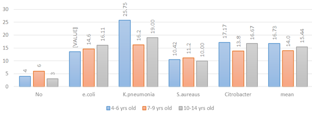 The result of this experimental study is disclosing that camel’s urine constitute potent ingredient to kill or inhibit the growth of bacterial species tested on regardless of the gender of the camel as the result demonstrated that 15.32 ±0.94 mm and 15.11 ±1.02mm of inhibition for female and male camel urine respectively Table 3, which has almost no significant difference and both have significant ability to prevail against the growth of bacterial species since their p-value is 0.067 and it is greater than the significant p-value( 0.005)and the study in agreement with study in Sudan (Osman, Lodiong, Siddig, & Abdullah, 2018) that reported both female and male camels urine can kill bacteria. Also on the age perspective, the result indicated average inhibition of 4-6 years (16.72 mm), 7-9 years (13.95 mm) and 10-14 years (15. 44 mm) and there is no significant difference among the different ages of the camels and similar observation have been reported by study in Kingdom of Saudi Arabia (Bakhsh et al., 2019) Figure 3.