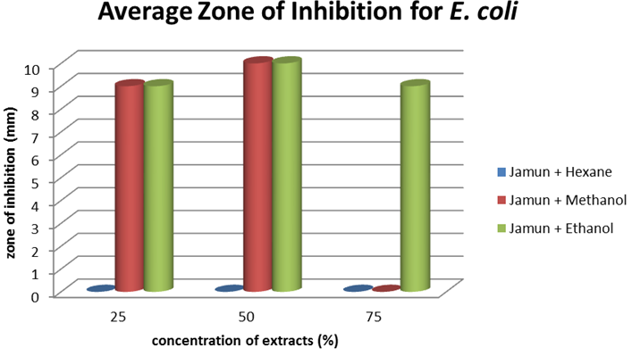 When tested against E. coli, the methanol and ethanol extracts of Jamun both in the concentration 50% were most effective. The 25% methanol and ethanol extracts and 75% ethanol extracts followed.