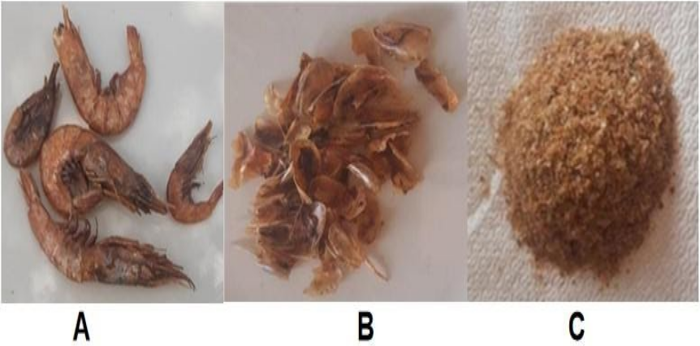 As shown in the figure below are the stages of the sample preparation showing the raw shrimp shells of freshly washed shrimps that has been air dried. The Figure 1A depicts shrimps after it has been dried in the oven, Figure 1B shows the shells neatly removed from the shrimps and Figure 1C shows shrimp shells grinded into fine particle to be used for further analysis.